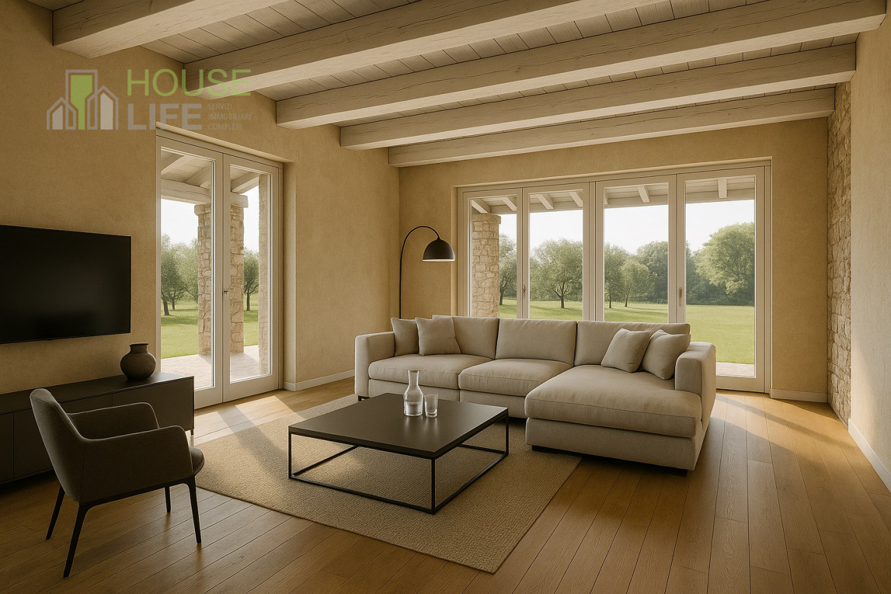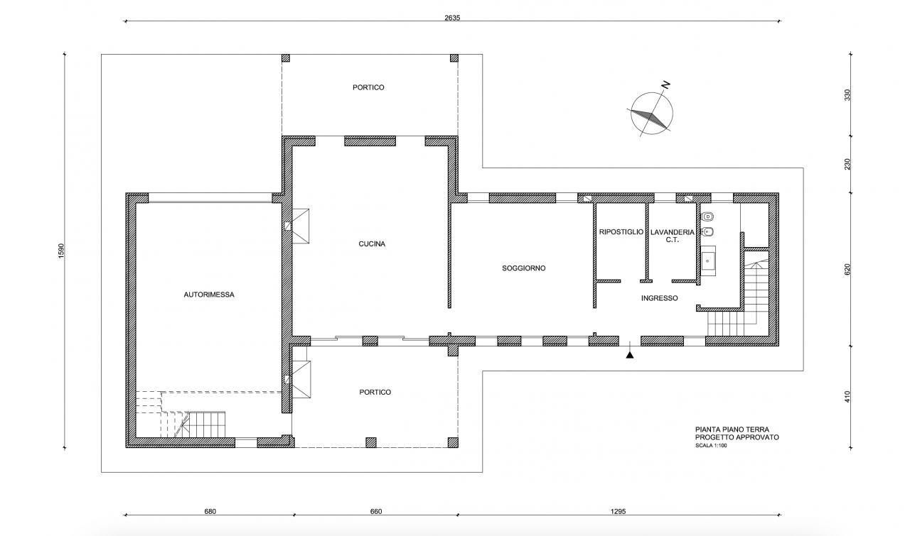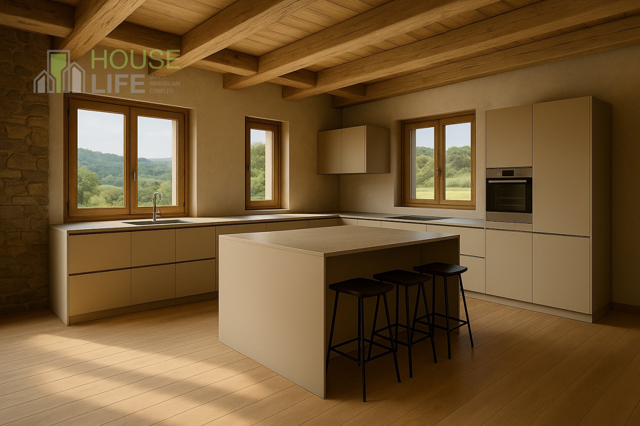 Piano terra: cucina, soggiorno, portico, studio, bagno, lavanderia, garage triplo con soppalco