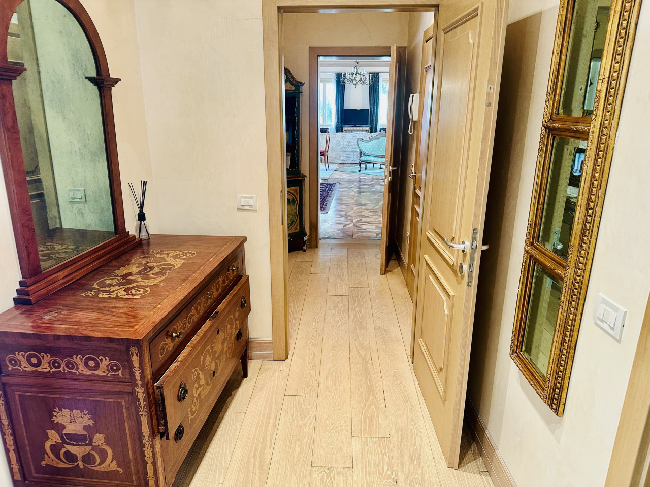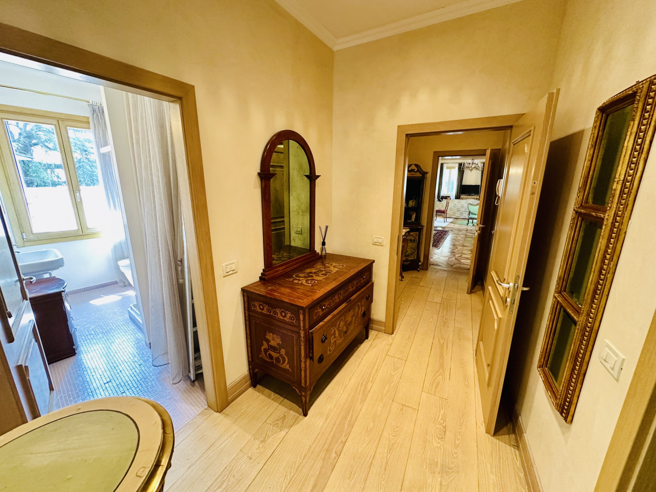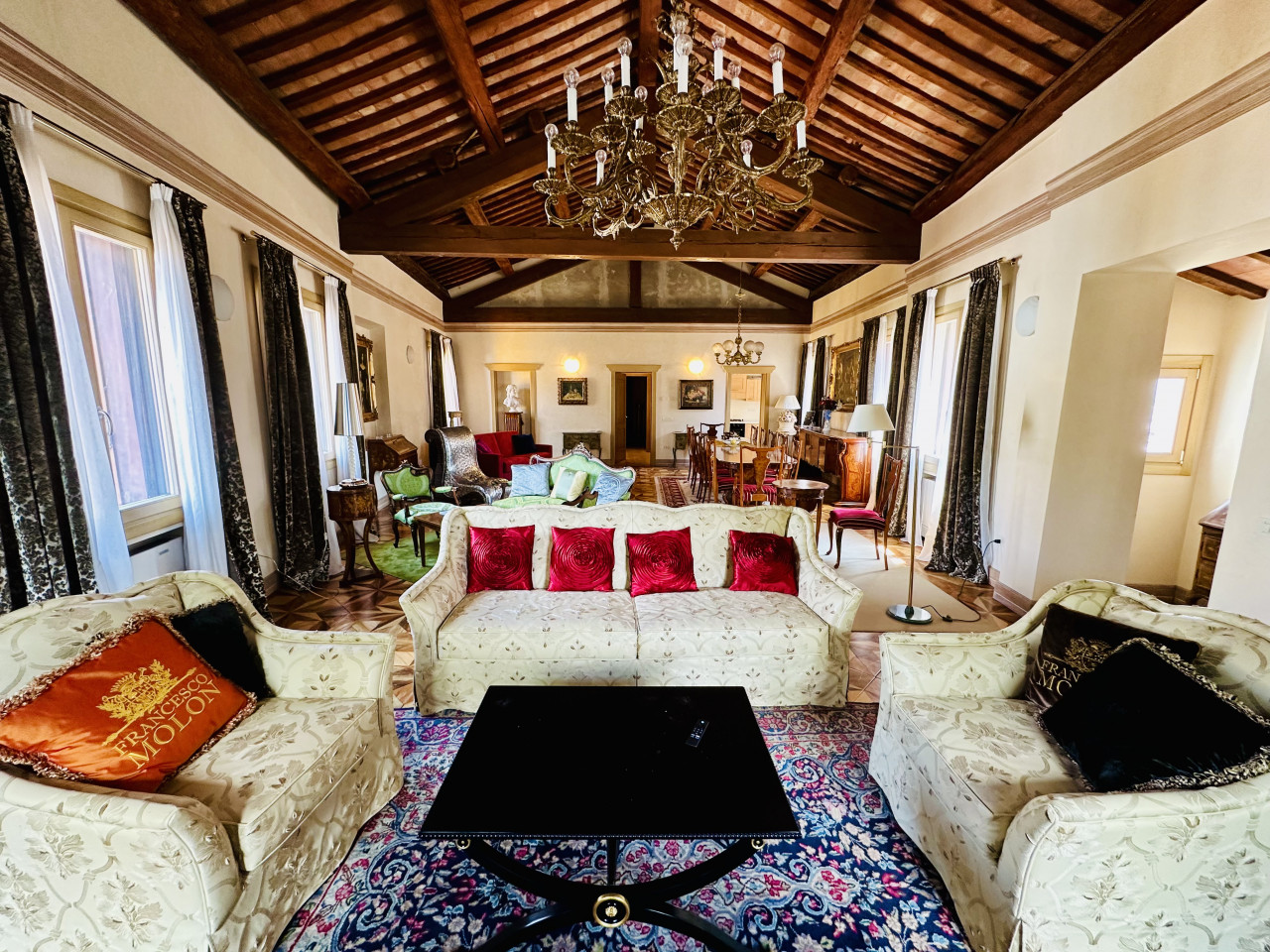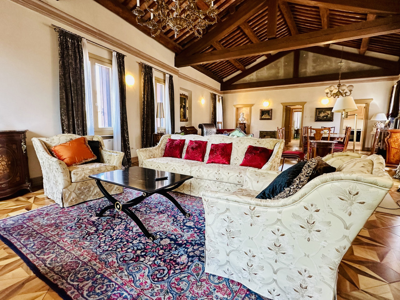 L’appartamento si sviluppa su un unico livello e si presenta in ottime condizioni generali, con ambienti ampi, luminosi e finiture di alta qualità. La zona giorno, ariosa e ben distribuita, si apre su ambienti di rappresentanza, mentre la zona notte offre camere confortevoli, bagni curati nei dettagli e spazi di servizio ben organizzati. L’atmosfera interna è resa calda e accogliente dalla presenza di travi a vista, parquet in legno naturale e dettagli architettonici originali sapientemente valorizzati.