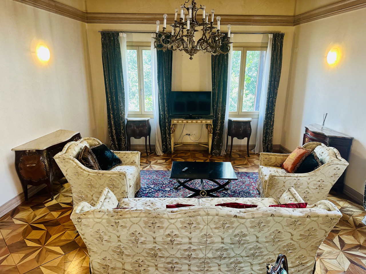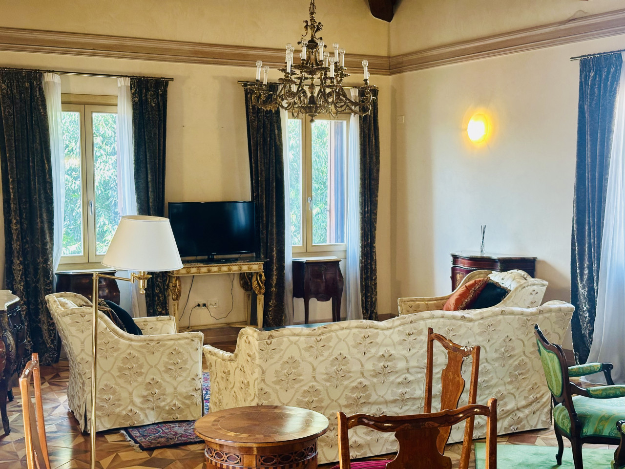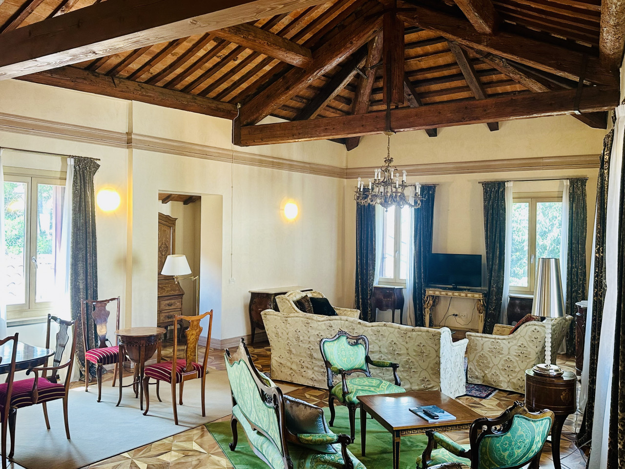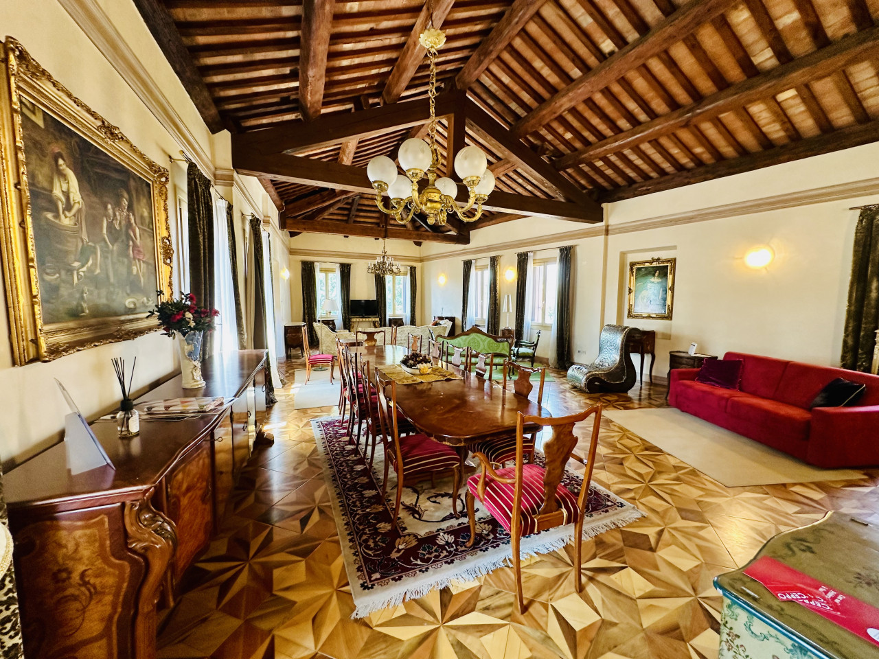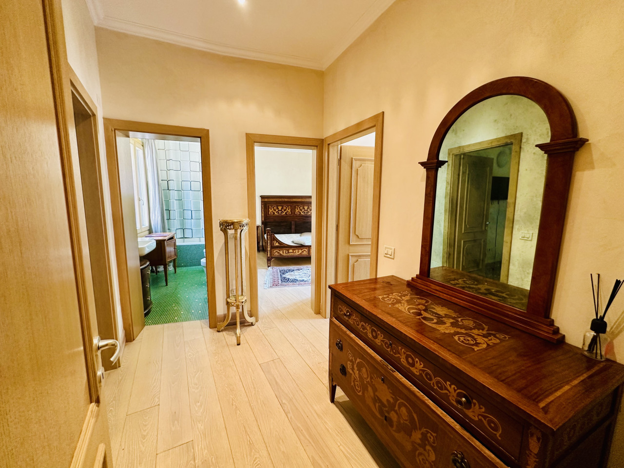 L’appartamento si sviluppa su un unico livello e si presenta in ottime condizioni generali, con ambienti ampi, luminosi e finiture di alta qualità. La zona giorno, ariosa e ben distribuita, si apre su ambienti di rappresentanza, mentre la zona notte offre camere confortevoli, bagni curati nei dettagli e spazi di servizio ben organizzati. L’atmosfera interna è resa calda e accogliente dalla presenza di travi a vista, parquet in legno naturale e dettagli architettonici originali sapientemente valorizzati.